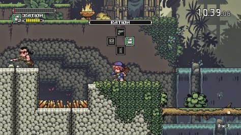 Mercenary Kings attempts to satirize general tropes of action games with cutscenes that look like a pixelated version of the codec from Metal Gear Solid. The game has some good humor, but like the robot dog with butt cannons that happens to be controlled by a dog, it never really sticks around. The lack of real cutscenes and meaningful dialogue doesn’t help the story stay fresh, especially after traditional cycles of “save a member of your team, find some blueprints, and destroy stuff”. Also, while the game does have some hits, it also has many more misses due to the lack of potential without the inclusion of voice acting.
