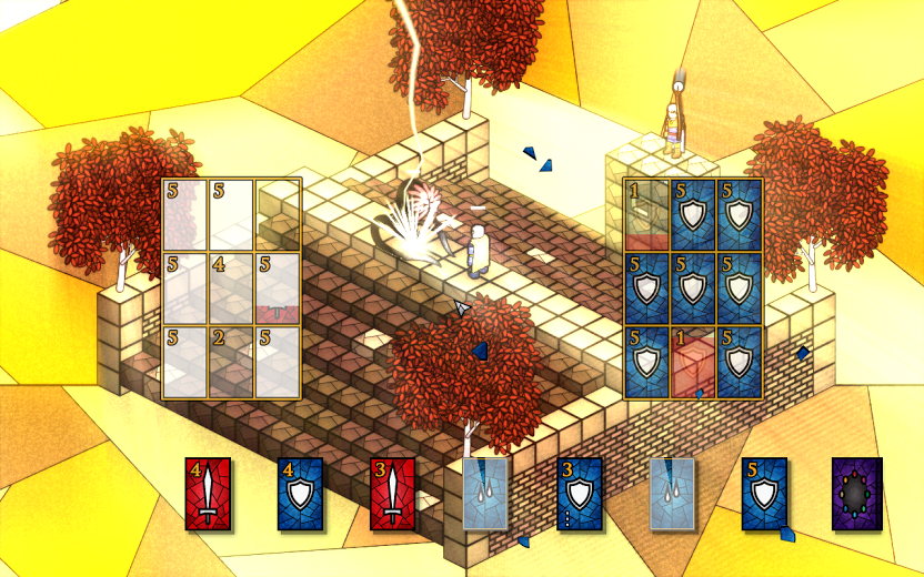 Dual Wield Software further elaborates on the battle system, “Cards come in four types: attack, defense, magic, and utility, and these come in different sizes and magnitudes. Attack and defense cards are placed in their specific grids, and you’ll be managing both grids at the same time. Magic cards come in eight different elements and are placed directly onto the playing field. Finally, utility cards act as armor upgrades and non-elemental magic.”
