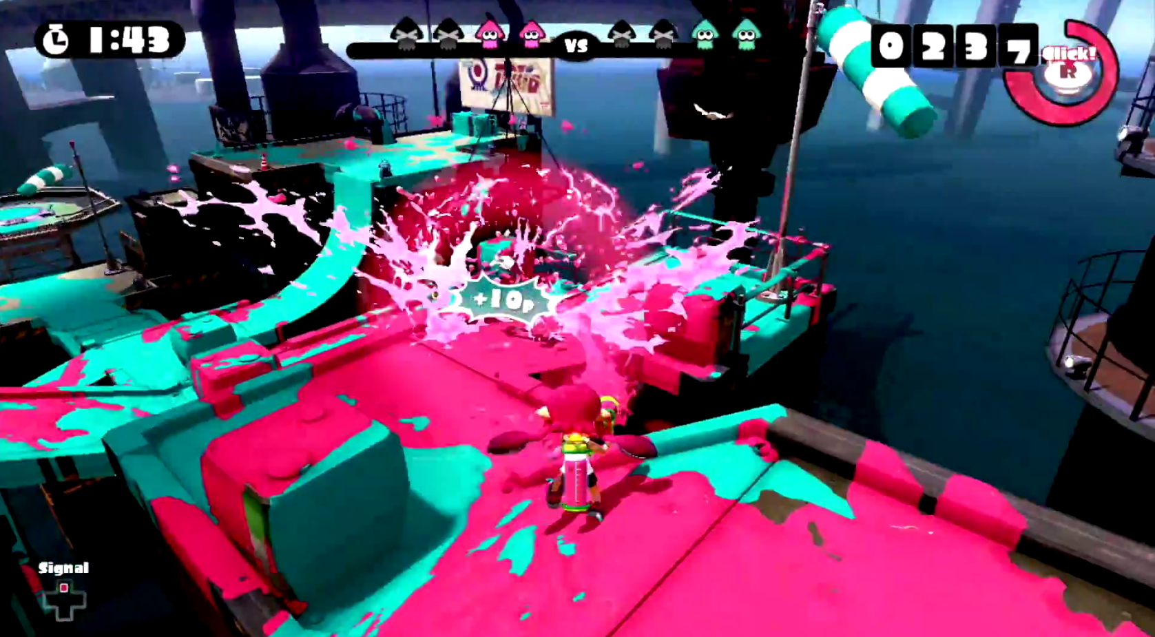 Each shot fired is a blast of ink in the team’s color. This ink is fundamental to the gameplay in a couple of ways. First, whichever team covers more of the level with their color ink wins the match. Second, players move faster through their ink and can change forms from a humanoid to a squid to swim in their own color ink. Third, hitting an enemy with your ink color stuns them in a way that they cannot immediately contribute to the game.
