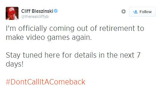 Today, Cliff Bleszinski announced on Twitter that he is coming out of retirement, and that a new game will be announced in seven days. Cliff Bleszinski has been in the video game industry since 1994 with the release of Jazz Jackrabbit for the PC developed by Epic MegaGames, which is now simply known as Epic Games.