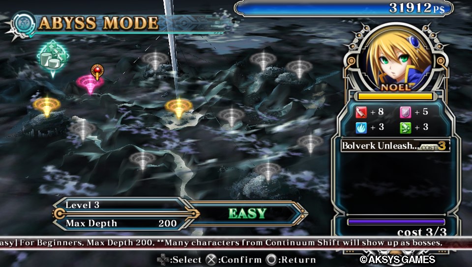 My favorite mode, however, is called Abyss. This mode presents you with several “dungeons” of various sizes and difficulties to fight through. Each dungeon is just an endless stream of enemies to fight, and you advance by landing hits on your opponent. At regular intervals, you’ll be interrupted by a difficult boss fight; and if you defeat all the bosses, you win! What makes the mode special is that, after every boss, you’re given a choice of four rewards to apply to your character. These might increase your score, replenish your health, or, most interestingly, increase your character’s stats. You can also find equippable abilities to further enhance your fighter. These upgrades are all permanent (within Abyss mode, of course), lending an addictive sense of character progression that I’ve never seen before in a fighting game. I can see myself sinking a lot of time into Abyss mode alone. There is another, unlockable mode that I won’t spoil, but it’s an interesting test of both your maneuverability and damage output for each character.