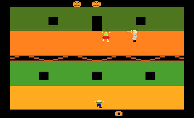 Halloween is based on the 1978 slasher movie of the same name, and the goal is to lead as many kids as possible to safety without getting decapitated. There is no real story to speak of: you just keep playing till you die and try to beat your own high score. There is only one level: a simple 2 story house. As basic as it is, the setting works really well. The game assumes you are familiar with serial killer Michael Myers and the idea of teenage slasher movies. That is really all you need to go on.