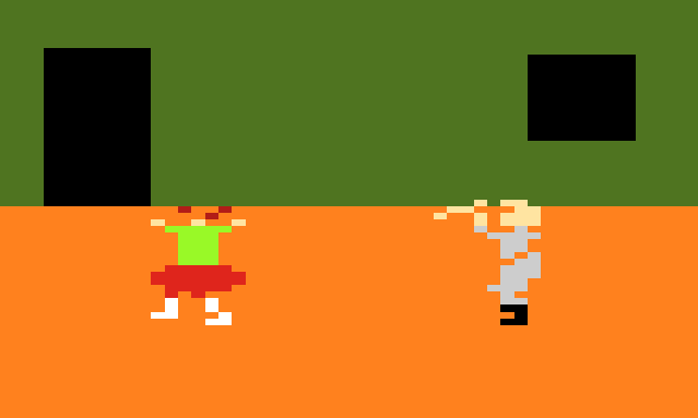 As far as looks go, this game doesn’t exactly need Titan graphics cards to run smoothly, however it looks good for an Atari game. It came out late in the 2600’s life cycle (1983) so it pushed that hardware to it’s limits. There is an impressive blood animation whenever the player character is killed and the models are at least semi-recognizable, which is rare for the Atari 2600.