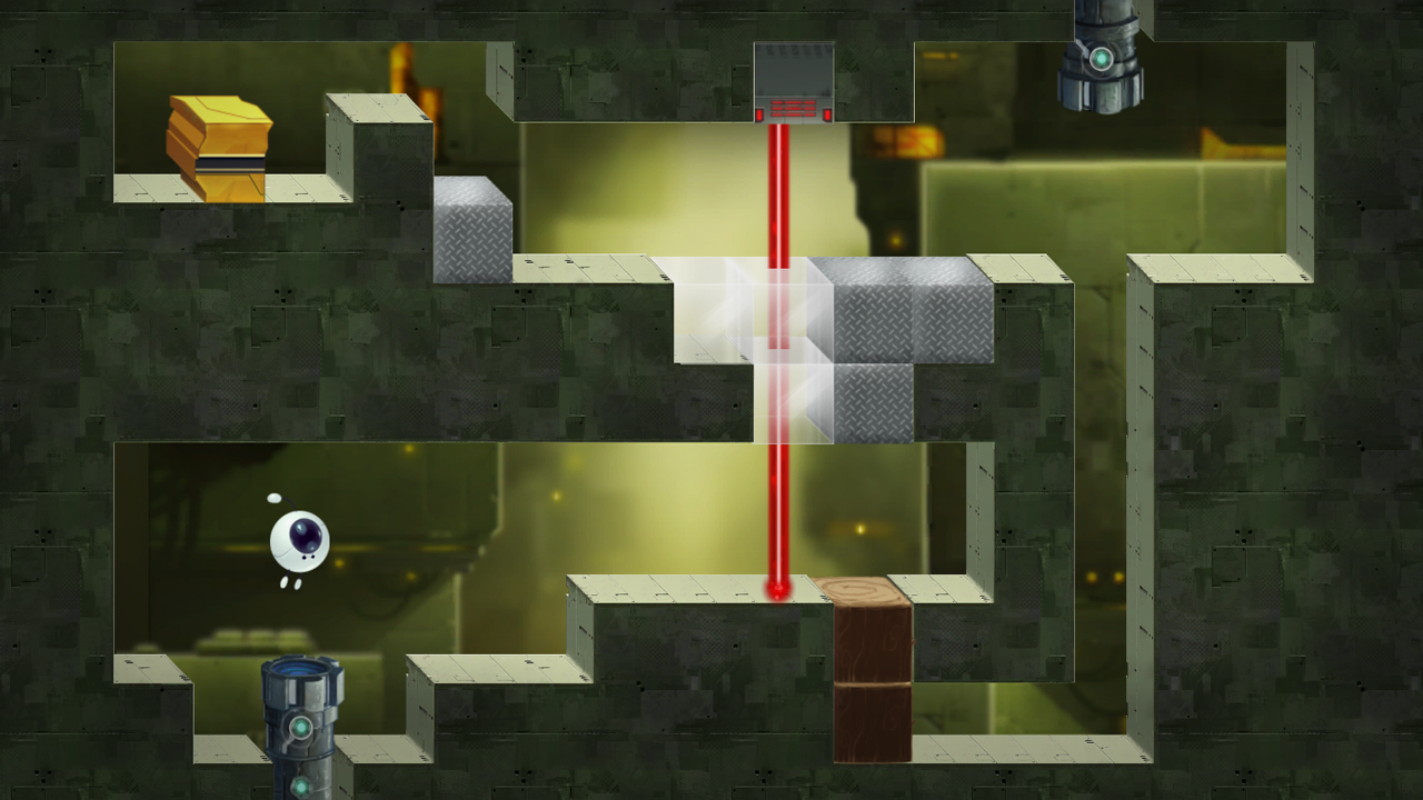 The difficulty comes in the variety of different blocks (wood, iron, stone, slime, etc.) which can be affected by level elements. Send wood through a laser, and it starts on fire, while doing the same to sand will turn it into glass. Slime sticks to walls, so you can use it to hold blocks up, but its stickiness also prevents you from sending it through narrow corridors. In addition, Psychobot cannot pass through lasers or electric beams, so it’ll often have to fling blocks across the room to hit a switch or block off an obstacle. You’ll also run into walking blobs, which can help or hinder depending on their location (and whether or not they are on fire).