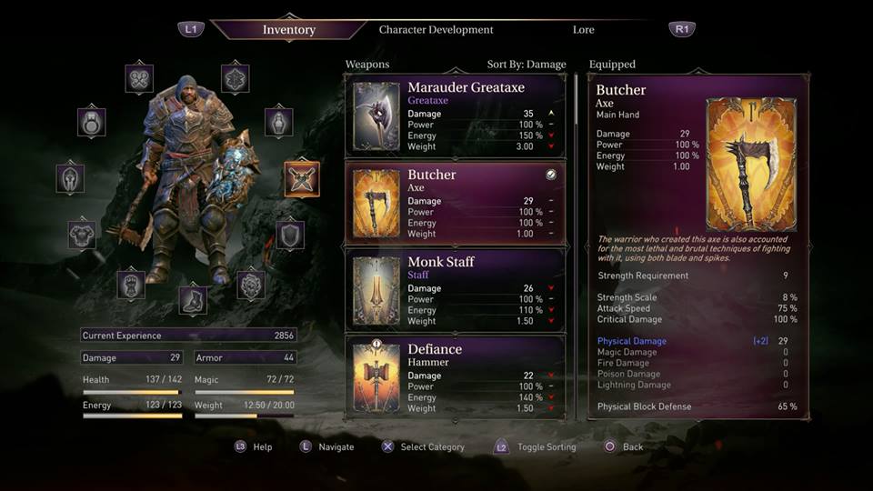 Holding down the bumper or trigger you’re pressing will charge up Harkyn’s attack to be more powerful. Doing this, though, sacrifices time and makes Harkyn vulnerable to the many enemies that will be surrounding him at all times. The fights in this game do remind me of Demon’s Souls, but it seems slightly more forgiving than that game. I enjoyed how the game let me choose a weapon class and magic type at the outset of my adventure, but overall the combat experience you choose doesn’t limit you to that certain weapon set. I opted for the fast and swift rogue, partly because my problem with the Souls series is how slow the combat feels. The rogue class is the speediest class in the game because its light armor sets and daggers allow the player a high level of mobility. Killing each and every generic enemy will eventually bring rewards for Harkyn, as new weapons and armor sets will be randomly dropped. After trying heavier armor and two-handed weapons, I was definitely glad I chose the rogue class. The stat increases granted by choosing this class definitely helped me progress through the game at a much faster pace. Another interesting addition to this game is the Gauntlet, which is a long-range firing device comparable to a bow and arrow (which is missing in action in this fantasy RPG). The Gauntlet uses magic from your meter, so you must choose between spells or long-range attacks, which creates an interesting dynamic when you’re in the middle of an encounter.