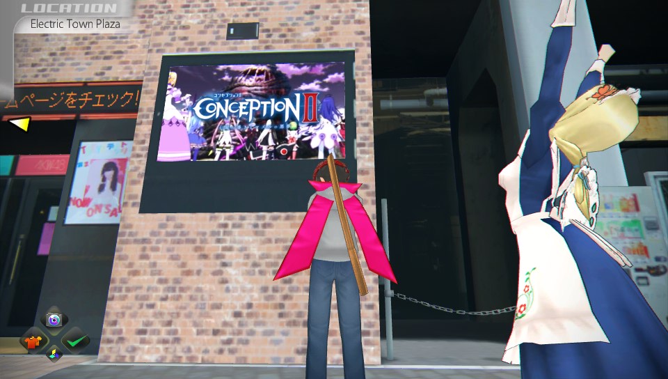 This devotion to its target audience shines through when it comes to the environment design. The game plays out in a re-creation of the streets of the real Akihabara in Tokyo, and while it’s a bit lo-fi (the environment and character models look like they’d be more at home on a late Dreamcast or GameCube game), the attention to detail throughout is incredibly impressive. The various stores you can visit to buy items, weapons, and “armor” are all digital recreations of actual shops in Akihabara. Video screens all over the open world play a rotation of real Japanese ads for real games and anime. Standing at street corners are women in waitress outfits who hand out real ad flyers for real businesses in the area. If a virtual trip to Akihabara sounds like something that’s really fun to you in and of itself, it’s easy to recommend Akiba’s Trip based on that alone.