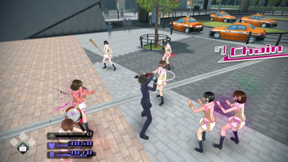 Of course, in this game you’re not attacking your enemies, but the clothes they’re wearing. You have three different face buttons for attacking high, mid, and low, targeting headgear, shirts/tops, and pants/skirts, respectively. Once you’ve worn down an article of clothing, you can hold the respective button to rip it right off your opponent’s back. Strip them down to their underwear, and they’ll either burn up (if they’re a Synthister) or just run away in embarrassment (if they’re human). There’s a fun risk/reward system at play through the Chain strip system – when faced with multiple enemies, you can try wearing down multiple articles of clothing at once. Once you’ve made a mess of several outfits, you can start stripping them all in quick succession, following sequences of button prompts punctuated by the sound of tearing fabric. The longer the chain, the higher an EXP multiplier goes, so performing this maneuver at every opportunity will be a big help. Pull off a long enough chain, and you’ll strike a pose that will (for some reason) knock the underwear off anyone who’s lost the rest of their clothing. (Have no fear: a bright, dazzling light covers your opponents when this happens. Wouldn’t want your precious innocence tarnished!)