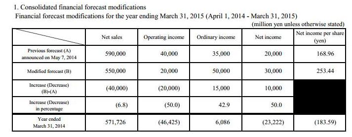 Based on the sales performance for the nine months ended December 31, 2014 and afterwards, net sales and operating income are expected to be lower than our original forecasts.