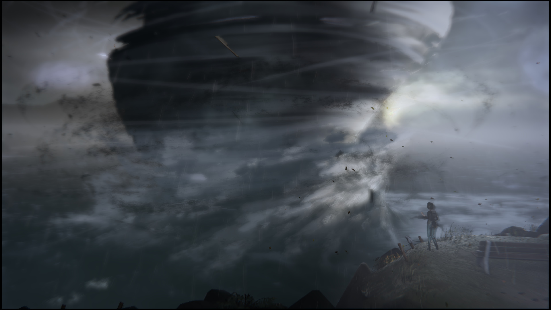 Set in the fictional town of Arcadia Bay, Life is Strange‘s main plot centers on the young photography student Max Cawfield. Almost immediately, it is apparent that there is something very different about this small town on the Oregon coast. The game’s opening finds Max near a lighthouse on a coastal cliffside, with a very large impending tornado in the distance. Moving towards the lighthouse, a boat is tossed by the storm into the side of the structure, which then topples on top of you. Then suddenly you wake up in Max’s art class, back into the real world from what seemed like a very bad dream. From here, Max continues life as normal and heads to the bathroom to clear her mind. In short order, a series of unfortunate events cause Max to realize that she has been unknowingly gifted with time travel powers. At this point the game opens up considerably, giving the player the choice to try out many different scenarios when interacting with other people.