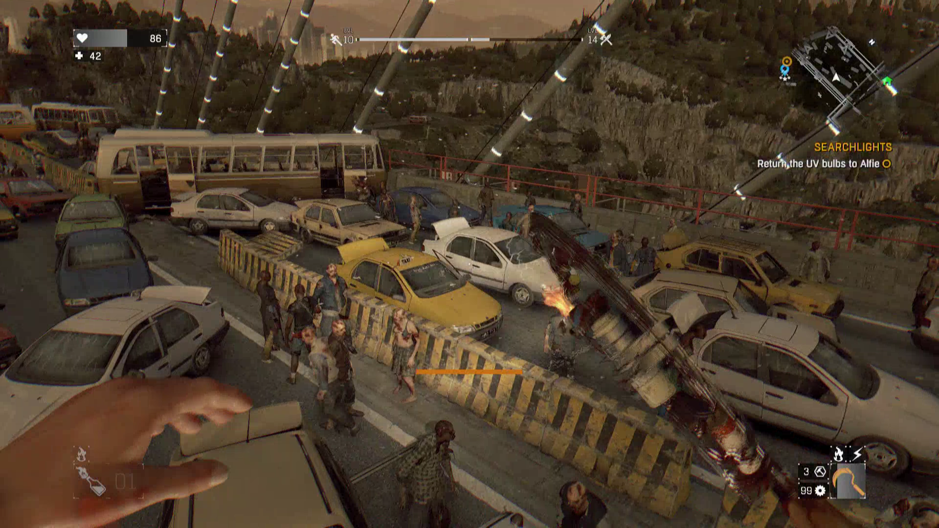 The day and night cycle is another cool feature in Dying Light.  Traversing Harran during the day is a cakewalk compared to doing it at night.  Zombies become much more aggressive and special “super zombies” called Volatiles only come out at night.  Volatiles can take an extraordinary amount of damage, even from the highest level of weapons, and they are able to deal out damage really fast, so it’s better to just never be seen by them or never let them catch you.  My first time playing at night (the mandatory story mission) left me never wanting to play at night again for fear that I would have a heart attack.  It took me nearly 15-20 hours to finally attempt a night mission again.  Of course, the more you play at night, the more you learn and the easier it gets.  But that never stopped it from being a heart-pounding experience.
