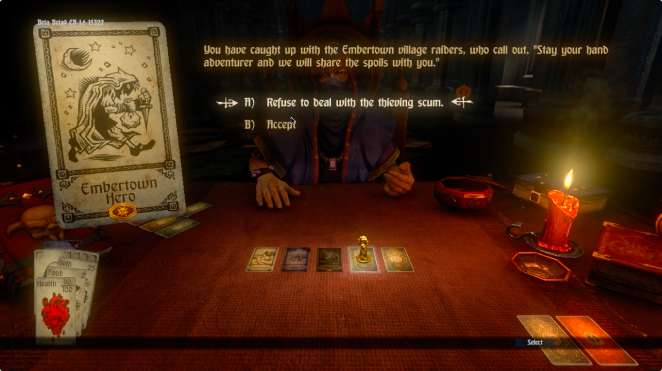 Gameplay has been fantastic in Hand Of Fate. When sitting at the table with the card dealer, he will lay out a series of cards. Each card presents a different situation. These situations can include coming across an item shop, spotting an item in a canyon, meeting a priest, and being attacked by bandits. When you flip each card, you a presented with text that gives you the details to the scenario in your story. This can lead to a card shuffle game of chance, drawing an item card, or using your gold at a shop.