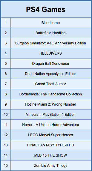 This is going to sound blasphemous but I have yet to play Bloodborne. Everything about it interests me but just not enough to purchase it. Maybe it’s because all of March I have been enveloped by challenging games like: Hotline Miami 2, Olli Olli 2, and Axiom Verge. If I was to add Bloodborne to the mix I might go crazy. As for the of best selling games, the PS4 list isn’t surprising but isn’t the PS3 list looking random? Also, Gravity Rush is at the top for the PS Vita. Hopefully this illustrates interest for that sequel. In the PS Classics section it looks like everyone possible purchased Final Fantasy 7. There are no new customers left and it leaves the top 10.