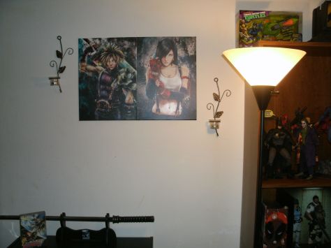 The posters I finally settled on were based on characters from two of my favorite games of all time: Final Fantasy VII (FFVII) and Resident Evil HD (REHD). The first is Chris Redfield from REHD, originally painted by Eden Design. The second and third were designed as a pair by Barrett Biggers, featuring Cloud and Tifa from FFVII.