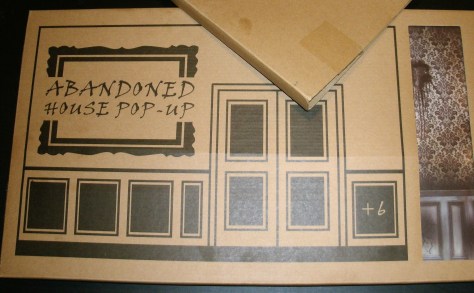 The Abandoned House pop-up set consists of six panels (12” tall, and about 20” wide) as well as an additional bookcase for decoration. The bookcase is essentially a small, rectangular box that must be flared open, at which point you fold in the top and bottom flaps. Voila! If only Ikea’s products were so easy to assemble. That said, the cardboard is so thick and sturdy that the flaps stubbornly try to return to their flattened state, so you may want to use a tiny bit of scotch tape to keep them in place.