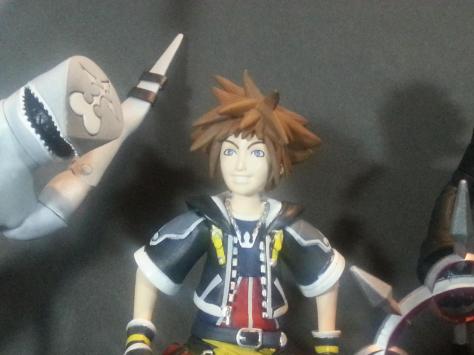 His head sculpt is decent, featuring his trademark wild hair and a goofy smile. His eyebrows, lips, and eyes are all well sculpted and clearly defined, but his hair suffers from rather soft, bland detailing. You can kind of see a few thin lines molded into his hair if you look closely enough, but for the most part it appears as though Sora is wearing a spiky brown helmet.