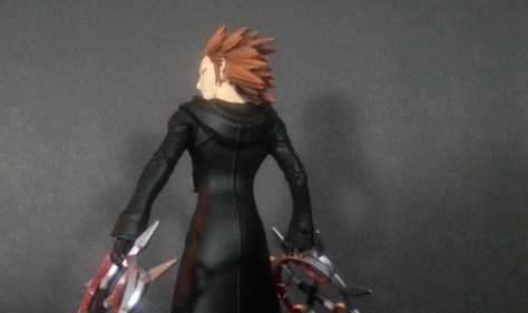 Axel’s clothing is more representative of the in-game model. The sleek, almost form-fitting black coat is elegantly recreated and bears the appropriate accents, such as the silver zipper and drawstrings. The coat itself is made from the same hard plastic as the rest of the figure, which restricts articulation, but I’ll go into more detail later.