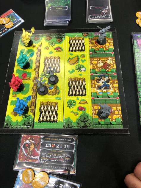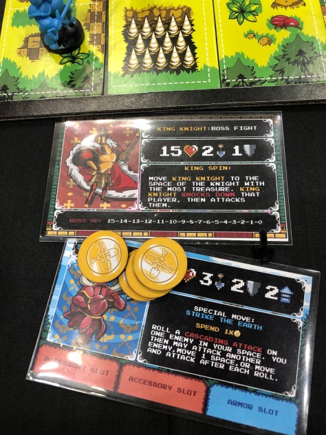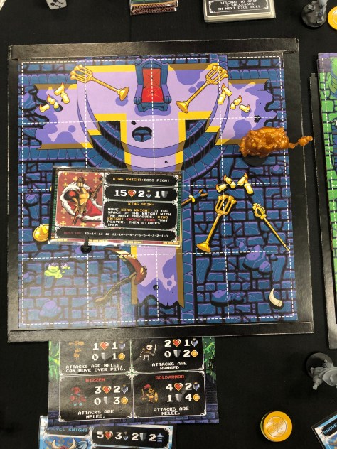 Once we clumsily (in a good way!) pushed through the base level, we faced a much larger threat – the boss stage against King Knight. Similar to the original game, each boss has a set number of attacks and patterns. Elevating this notion into a board game, each boss has an 8-card deck of moves that are inspired by the original game. Players can haphazardly move around the board to avoid attacks and inflict their own damage to the boss. However, to the astute if the battle lasts several rotations of the deck, players can anticipate and adjust their movements from the boss’s predictive order – another fantastic cornerstone from the franchise. To our unlikely success, we opted for an “all out” approach due to the nature of our demo, so we were NOT the astute group that memorized patterns…