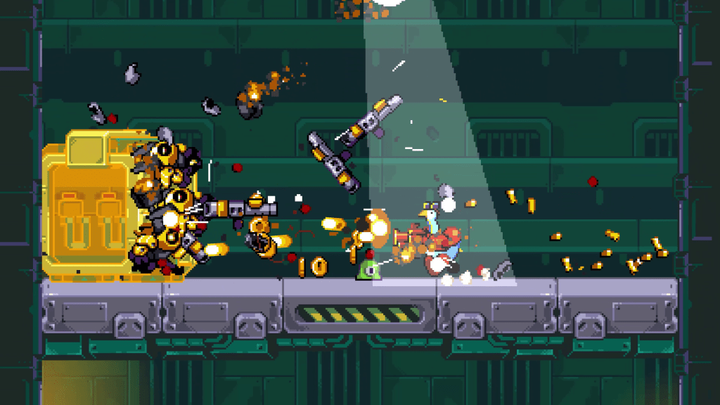 The gameplay is a great modern adaptation of the run-and-gun games from the 1980s and ‘90s. As Goose, you traverse through each level-based scenario, all the while blasting your way through loads of enemies, minimizing your own damage, while also collecting valuable health packs and ammo for the various weapons. The game does a really nice job at making you feel powerful while you’re onslaughting the enemies, while also cranking the difficulty just high enough to make sure you balance total carnage with health management. This isn’t a game that you can solely run-and-gun without forethought. Instead, you run-and-gun then dodge a bit, then run-and-gun again, and so on. This broke up the monotony quite a bit and helped me focus on my precision and not rely on blind fury.