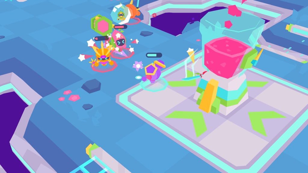 The other side of the gameplay focuses on Gobabots, the in-game arcade where two teams of four compete to get the most points by chopping down fruit and placing it into a central giant-sized blender. It almost made me think of a very rudimentary MOBA (maybe?) where each person has a standard attack and special attack and if you defeat an enemy, they’re placed back into their team’s starting point. Unfortunately, I didn’t find this aspect of the game particularly fun or interesting. The gameplay was repetitive, despite having options to swap out your generic in-game character throughout the game. I ended up mostly playing the Gobabots game for only required story-driven portions, but additional opponents are throughout the game as optional encounters if you want to delve deeper into it.